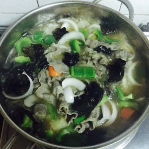 牛肉切好后用开水焯一下,去掉血沫沥干待用。我用的是牛腩肉,看个人口味。