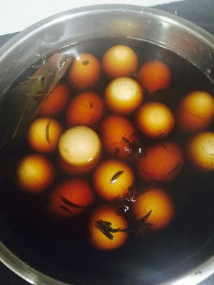 肉桂,八角,香叶,冰糖粉,盐,酱油,红茶包,水煮沸后,把蛋放进去煮15分钟,然后浸泡1个小时以上