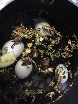 将准备好的茶叶【最好用红茶叶】、八角、冰糖放入沸水中,水量为刚好淹没鸡蛋为佳。