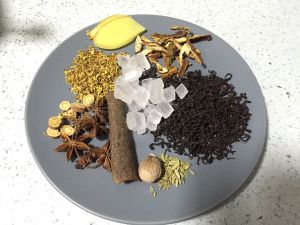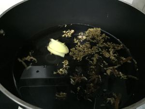 一包茶叶,红茶和铁观音都可以,再来两片蒜,拍一下,外皮不用去,一个八角一片橘皮