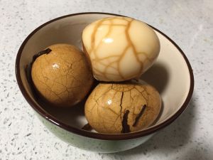 浸泡一夜的茶叶蛋外壳已经被酱油的颜色给浸染了,是很漂亮的棕色
