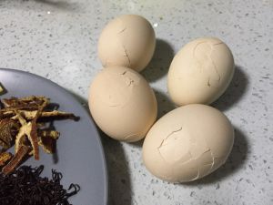 煮熟的鸡蛋放凉以后,把壳敲破,重新放入锅中