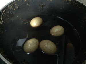 将敲好的鸡蛋放入锅中煮,转小火,煮一小时左右,中间要翻几次身。