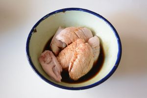 在鸡翅上撒上少许盐 一点酱油和料酒腌制一下