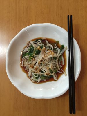 起锅烧油放入花椒干辣椒倒入调好的料汁里淋在金针菇上即可