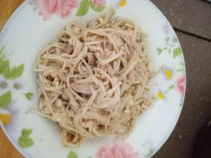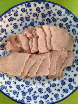 准备好猪肉,煮熟切片(煮熟后可以放冰箱冰冻一小伙,切的时候好切点)