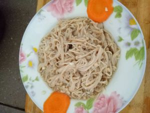 锅里烧开水,下入金针菇用水焯一下。焯完过一下凉水。焯金针菇的开水留下放入木耳进行泡发(节约用水),泡发后在清洗即可。胡萝卜削皮洗净檫丝。(以上步骤忘记拍片)