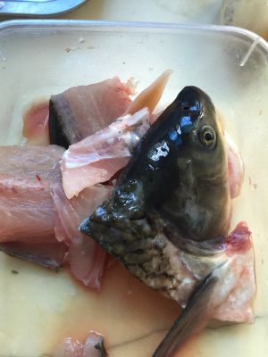 买了条生鱼 , 回来把鱼肉切出来,剩下的骨头鱼尾 鱼头, 切块,