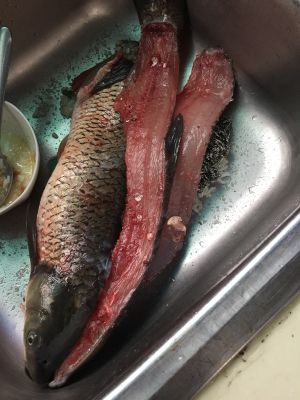 这就是今天买的新鲜的鲢鱼!船家自己网的鱼,10元两条随便挑,我就选了2条大的啦!
