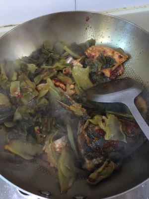 猪油和食用油烧热放入郫县豆瓣酱炒出红油,在放入鱼骨煎变色,再加入酸菜翻炒一下
