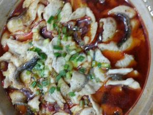 全部乘出,锅洗干净,热油放干椒和干花椒,鱼片上面放点葱,热油泼上。瞬间香味扑鼻。