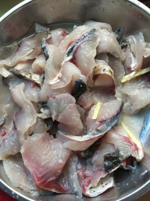 鱼肉切成蝴蝶片,用清水冲洗干净沥干,加入淀粉,一汤勺油,料酒少许,生姜丝,少许盐腌制几分钟