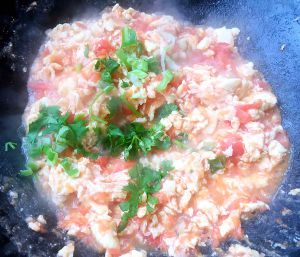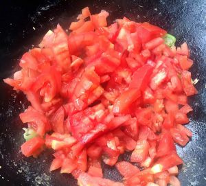 番茄全软后加鸡蛋翻炒一下,下葱花即可