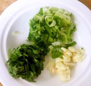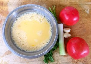 准备原材料西红柿、鸡蛋、葱、蒜、香菜备用