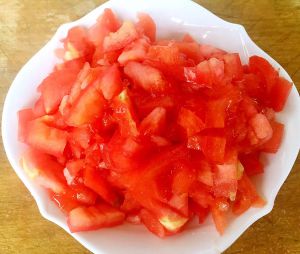 把西红柿丁煎成番茄酱,边煎边用勺子把番茄压扁,加点温水