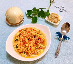 锅中放入少许油,放入葱花,将打散的鸡蛋炒熟盛出