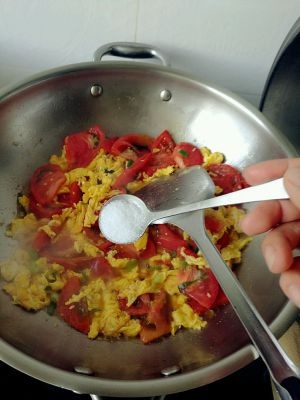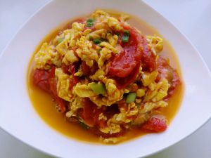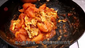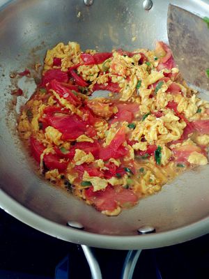 锅烧热去油,光锅,倒入鸡蛋煎香后,用炒勺划散炒香,鸡蛋炒香后盛出备用。鸡蛋盛出后,倒入西红柿大火煸炒,将西红柿炒软,炒出汁后倒入鸡蛋,加入适量的盐、白糖和老抽翻炒均匀。再下入葱段炒香,即可起锅。