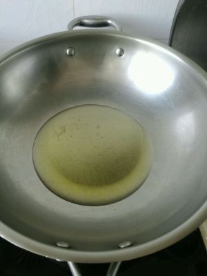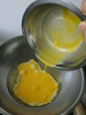 第一步,热锅下油。油热,把2个鸡蛋敲入锅内,翻炒碎。我比较喜欢炸的香香的鸡蛋。就会炒炸久点。然后把鸡蛋捞出放碗里。