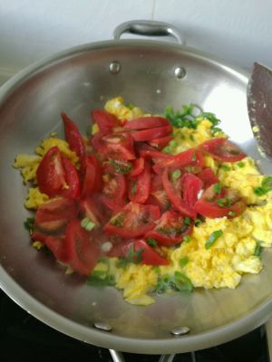 第二步,炸完鸡蛋锅里面还有部分油,直接把西红柿倒入,翻炒一下。(炒久就会软,稍炒一下,就是西红柿还是比较硬,看个人口味。自己选择)
