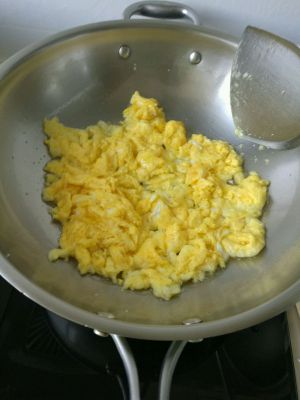 等蛋液稍微定型后用铲子翻动划开成小块,别炒老了。