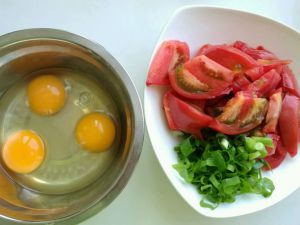 然后将切好的西红柿,加入大蒜,葱白一起炒至五分熟加入炒好的鸡蛋,西红柿炒至八分熟就可以加入葱花出锅了,非常简单的一道菜