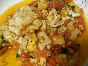 热油煎鸡蛋,煎好盛出,煎时用小火,看要好了就关火,锅的余温就能煎好鸡蛋。不用放油,不过觉得油少再加点,尽量少吃油。对身体好嘛!放柿子,翻炒几下,放糖,把柿子炒泛沙,这样柿子的营养就出来了,放葱姜蒜,这样香味就出来啦!放鸡蛋炒几下,就放点盐,就好了,最后摆个盘。放点香菜!