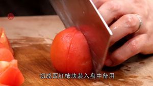 西红柿适量,在西红柿上打上十字刀口,将打了花刀的西红柿装入盆中并倒入开水,浸泡3分钟。取出西红柿剥去外皮,切成西红柿块装入盘中备用。