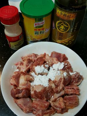 排骨加入鸡粉,盐(其它调味料含盐少放),糖,胡椒粉,生抽,拌均匀
