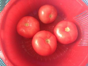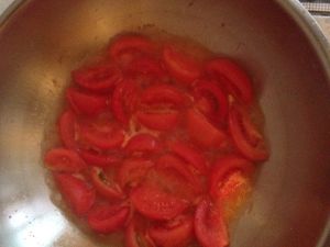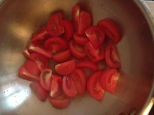 西红柿划十字刀加开水泡2分钟,去皮切块备用。