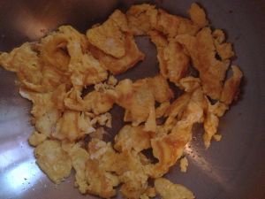 起锅烧油,五分热加入鸡蛋翻炒,凝固后出锅备用。