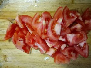 将鸡蛋入碗中,用筷子搅散。番茄洗净去蒂,切成小块备用。