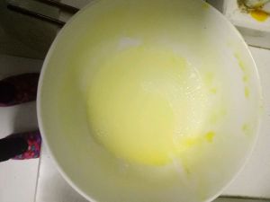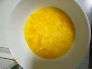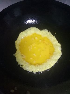 油烧至冒烟下鸡蛋液,(鸡蛋液再搅匀一下,防止蛋黄蛋白分离)