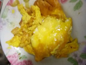 大火翻炒2分钟,如果觉得太干可以加一点点水,鸡蛋浇上去,个人喜欢这种吃法,炒熟即可