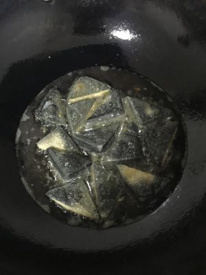 倒半锅油,油温至六七成热,下入臭豆腐块,中火炸至两面金黄