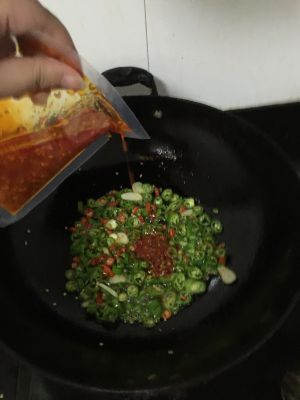 加入辣酱翻炒,青红椒炒至断生,加入盐,味精,酱油