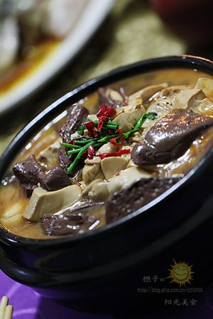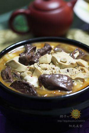水煮滚后放入臭豆腐和鸭血块 倒入一点生抽和酱油 再连汤带水的将材料转入煲中