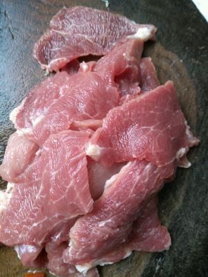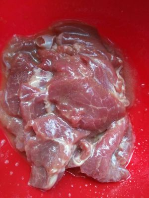 里脊肉切片,用刀背拍松,加少许盐,料酒,黑胡椒腌制