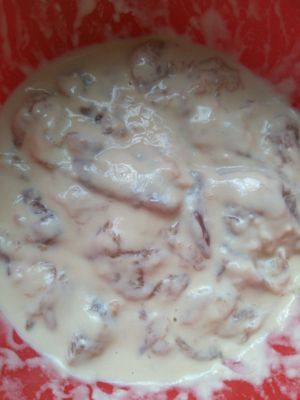 挂浆,将面粉与水混合成稠糊状,加入腌制的肉拌匀