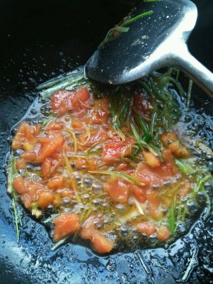 炒至西红柿烂出汁,加入一点点酱油,加入炸好的肉