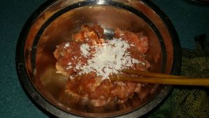 加盐,酱油和一点点糖调味肉馅,倒生粉进去然后用手使劲搅挞瘦肉和土鱿鱼肉,至肉浆粘手不掉下为止