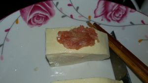 先用煎锅将肉的那一面煎一下【可放一些我们客家人说的qu,红红的像酒酿一样的长相,可磨成粉的那种 】再用煮锅,先放几片白菜一类,这个不特定,是为了防止豆腐长时间不翻,不想它糊了肉,将酿豆腐炖熟,用时一般十五分钟即可