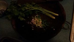 做酱汁了,先锅里倒油,油温不要太高,不然葱末就糊了,倒入葱末,生抽,加一点开水