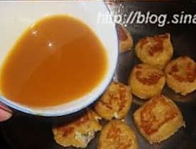 撒下葱花,就可以关火了。夹起豆腐泡装盘,把芡汁淋上去就可以上桌啦!