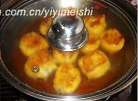 加入酱油、水,加盖焖炖一会儿。加入水淀粉收汁。出锅。