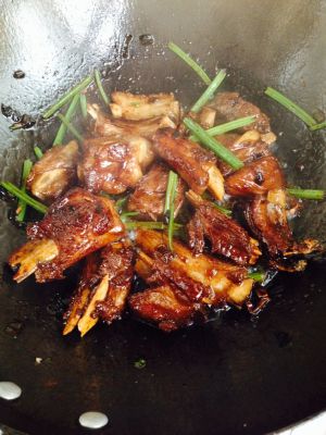 锅内留少许油,切记少许!放入葱姜,爆香。放入排骨,翻炒两分钟。