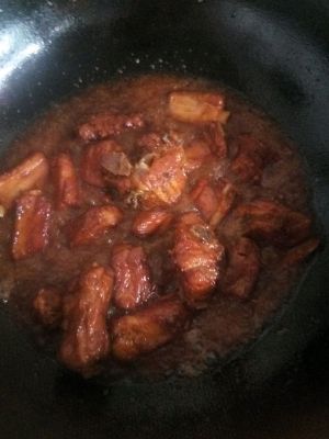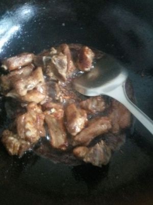 糖刚化就倒去排骨放老抽翻炒使排骨上色均匀。