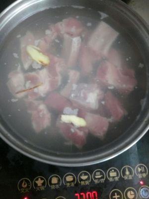排骨冷水下锅开火,放两片姜,一勺料酒去腥。