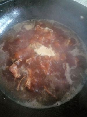 待汤汁炖剩三分之二时大火收汁。待汤汁发黑泛焦糖色小泡泡时加入两勺香醋翻炒关火。