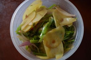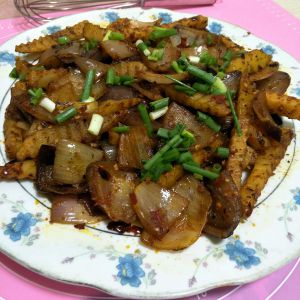 准备配菜。我在烤鱼的时候老公出奇的勤快,不等我拍照就把配菜炒好了。配菜大致有土豆片、芹菜、洋葱等,这些随意,自己想怎么配怎么配。我个人觉得烤过的土豆片特别香,芹菜容易入味,所以选择了这两种。