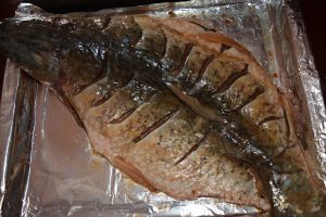 把烤箱里的鱼拿出来,这时鱼有9成熟了。